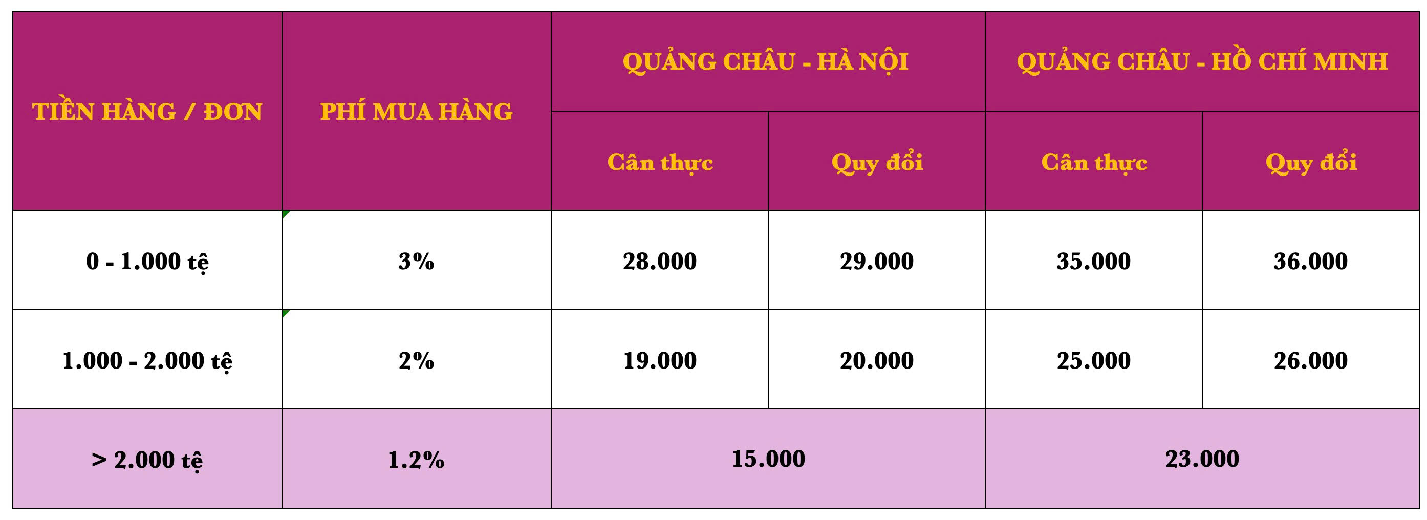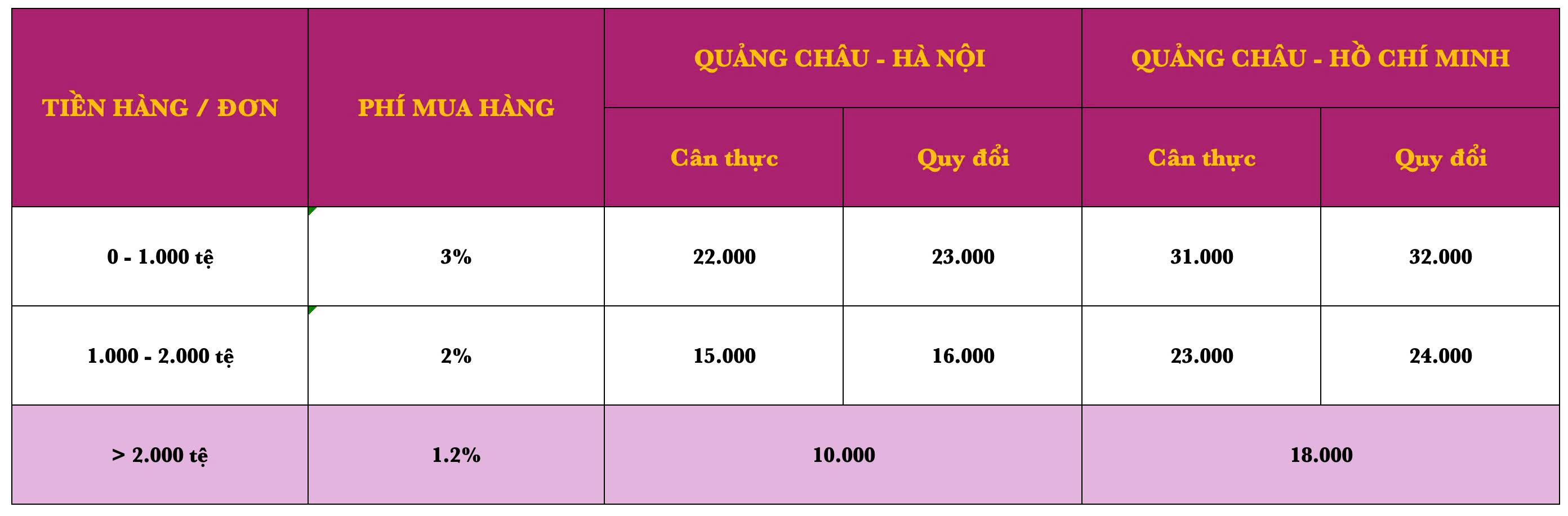 Lưu ý: - Mọi mặt hàng đều có cân nặng thực tế và cân nặng quy đổi theo khối. Cân nặng được áp dụng tính phí là mức cân nặng cao hơn giữa cân nặng thực và cân nặng quy đổi. Cân nặng quy đổi được tính theo công thức: (Kg) = (dài(cm) x rộng(cm) x cao(cm)) /6000. - Cách tính phí cân nặng: Phí cân nặng sẽ tính theo kết quả lớn nhất giữa tiền cân thực và tiền cân quy đổi, Ví dụ: Phí cân nặng của một đơn hàng vận chuyển trên 2.000 tệ về Hà Nội được tính như sau:
